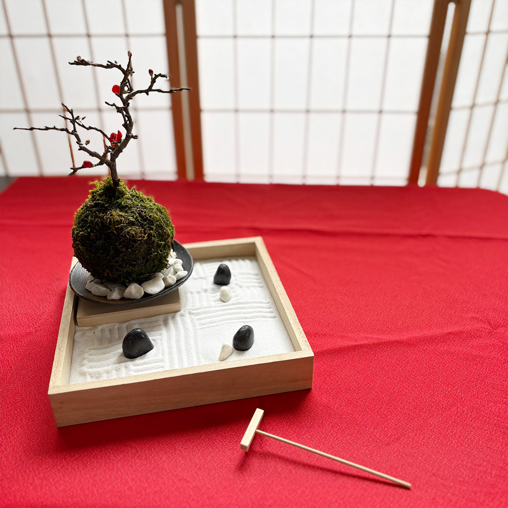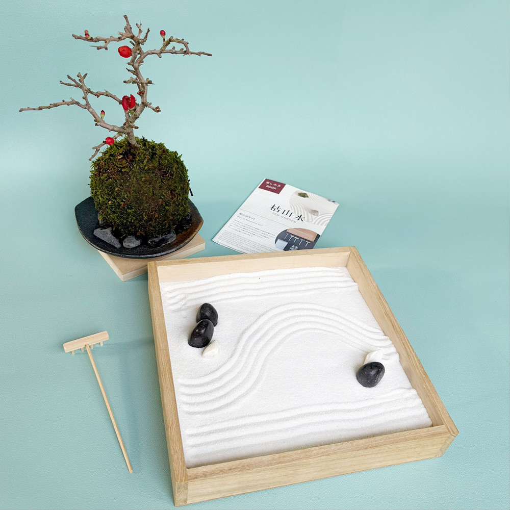 | 日本庭園をあなたのもとに。 【枯山水×苔玉】枯山水セット【玉砂利小サイズ】+長寿梅苔玉器セット | ||||||
