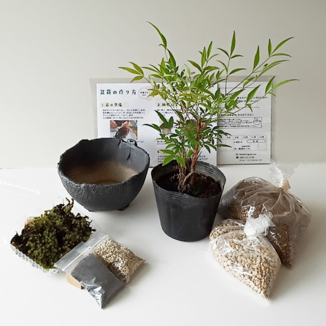 盆栽作りに必要な苔・鉢底土・用土・鉢(鉢底ネットはセットされています。鉢底ネットをつけた状態でお届けいたしますのですぐに植えられます 。おはしやハサミなどかんたんな道具だけご用意ください。