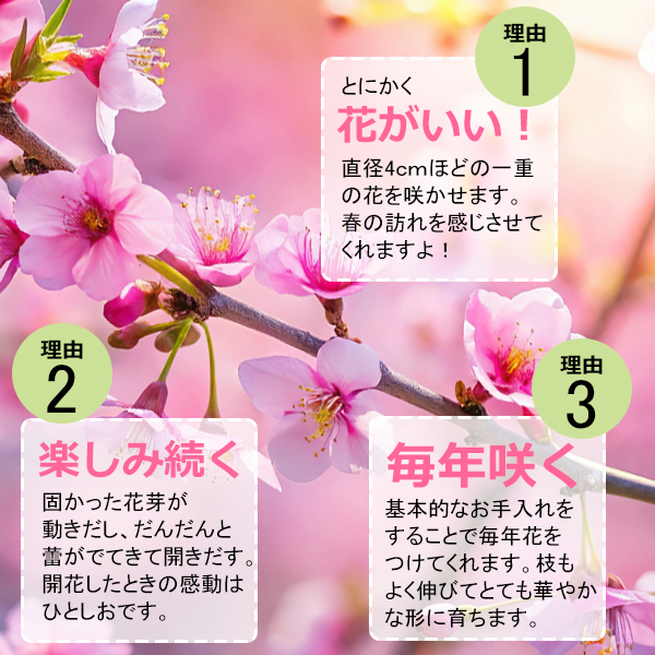| 【陽光桜】 直径4cmほどのお花が開花します。翌年も綺麗に開花させるため、夏の強い日差し以外は日当たりのいい場所で管理し春と秋に肥料をあげてください。7月~8月ごろに花芽がつくられます。(剪定は花後に長い枝を切り詰めます。詳しくは同梱する育て方のしおりをご参考ください。表面の土が乾いたら鉢の底から水がでてくるまでたっぷり与えて下さい。(土が湿っているようなら無理に与えないで下さい) | ||