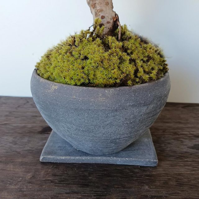 モダンな陶器鉢が旭山桜を包み込む 同色の下皿付き