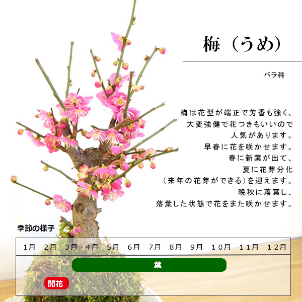 | 花・葉・実 | 梅は1~2月に花を咲かせ、3月に実が生ります。花後、花の芽を根元から2~3個残してカットしてください。秋~冬は葉が落ちます(落葉) |