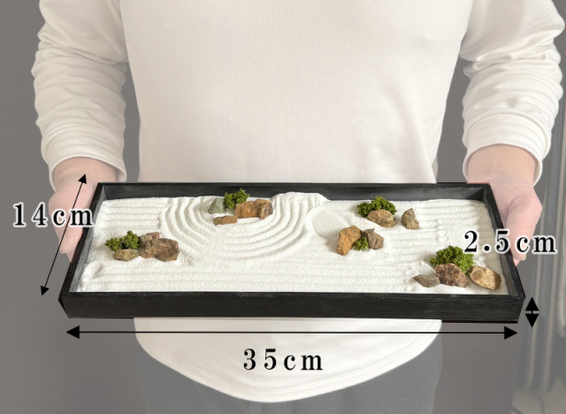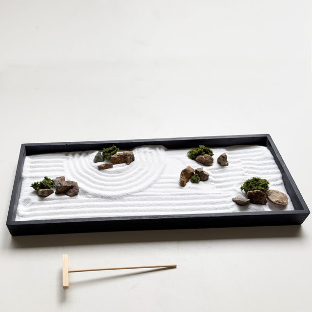 静かに心で石を置いて、砂に模様を描きます。京都 右京区にある龍安寺の方丈庭園をモチーフに小さな枯山水にしました。砂で川の流れや起伏を作って遊べます。龍安寺の十五石の庭を再現したり、あなただけのお庭づくりをお楽しみください。砂紋(模様)も描き放題 。 京都 右京区にある龍安寺の方丈庭園をモチーフに小さな枯山水に。ミニチュア庭園 minigarden zen garden 禅の庭