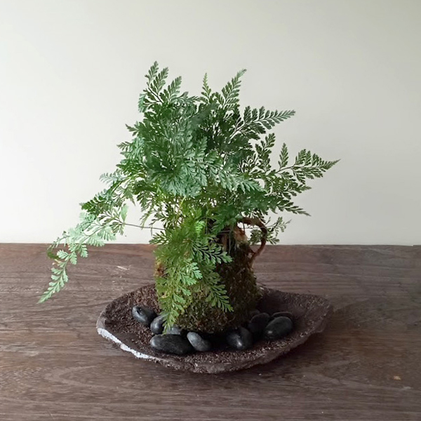 涼しげな葉が特長のシノブはツリシノブや盆栽などにも仕立てられる人気の高い植物です。シダ植物なので明るい日陰で育てられます。器は自然の風合いを感じるくらま岩器であわせてみました。