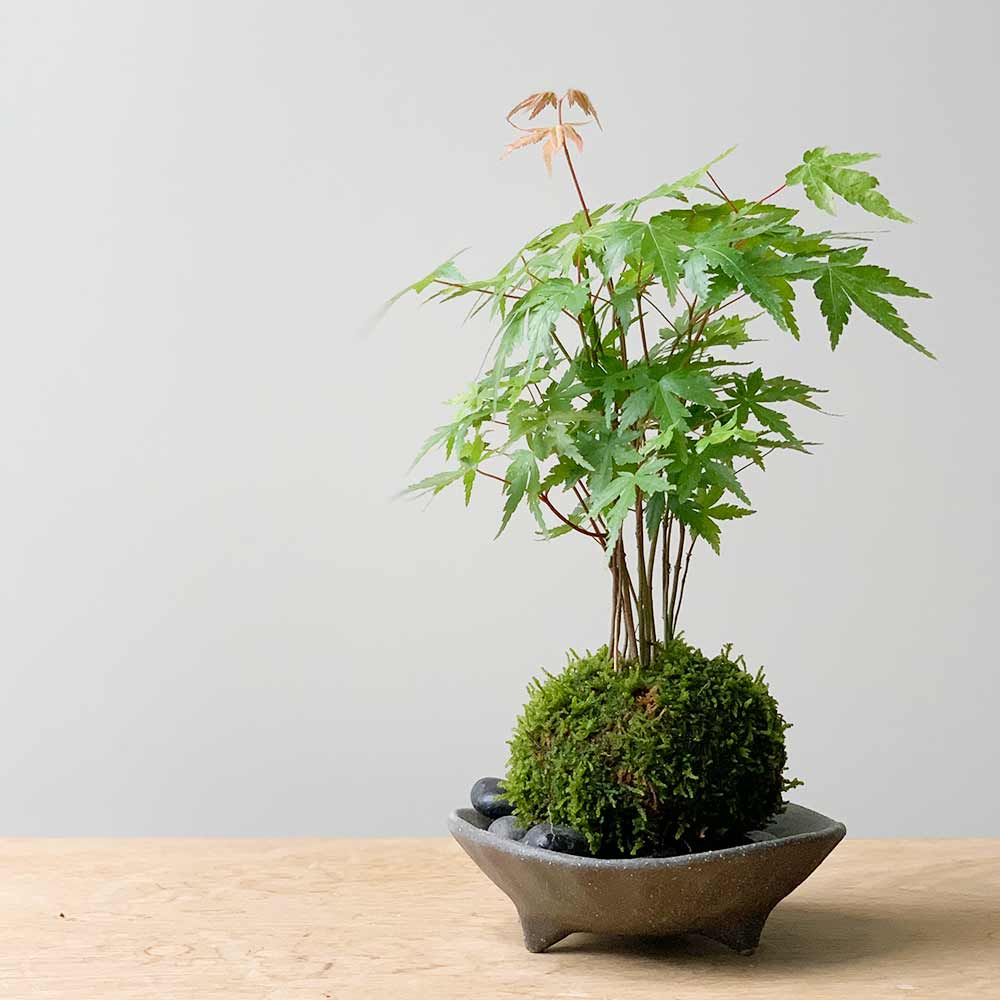 | 【モミジ】 盆栽(苔玉)では葉の切れ込みが、3つのものをカエデ、5つ以上に分かれるものをモミジとよんでいます。モミジは春先、鮮やかなライトグリーンの葉、秋はもちろん紅葉(こうよう)と日本の四季を感じる樹として、苔玉や盆栽など大変人気の高い植物です。たくさんの太陽をあてることと秋の温度差で紅葉の美しさは決まってきます。夏は水切れに注意してください(葉がチリチリになり紅葉しません) | |