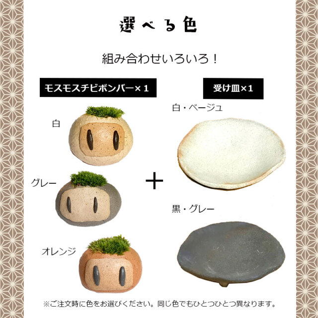 | セット内容 | モスモスチビボンバー(白系)、(グレー系)(オレンジ系)…いずれか1つ 受け皿(焼締)・・・(白・ベージュ系)または(黒・グレー系)いずれか1枚 育て方のしおり |